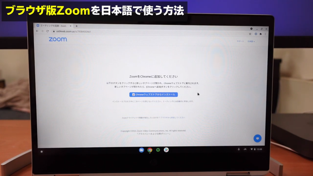 すでにzoom公式がChromebookの場合、「Chromeウェブストア版」のzoomをインストールすればOKと紹介していますが、この方法は問題があり、日本語じゃなく英語表示なんですよね。苦笑