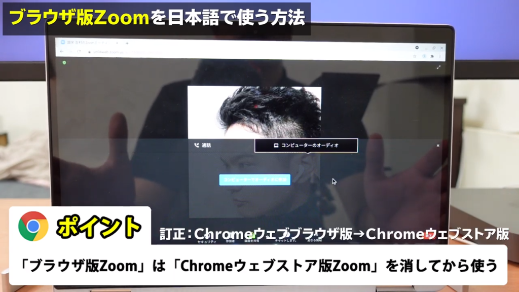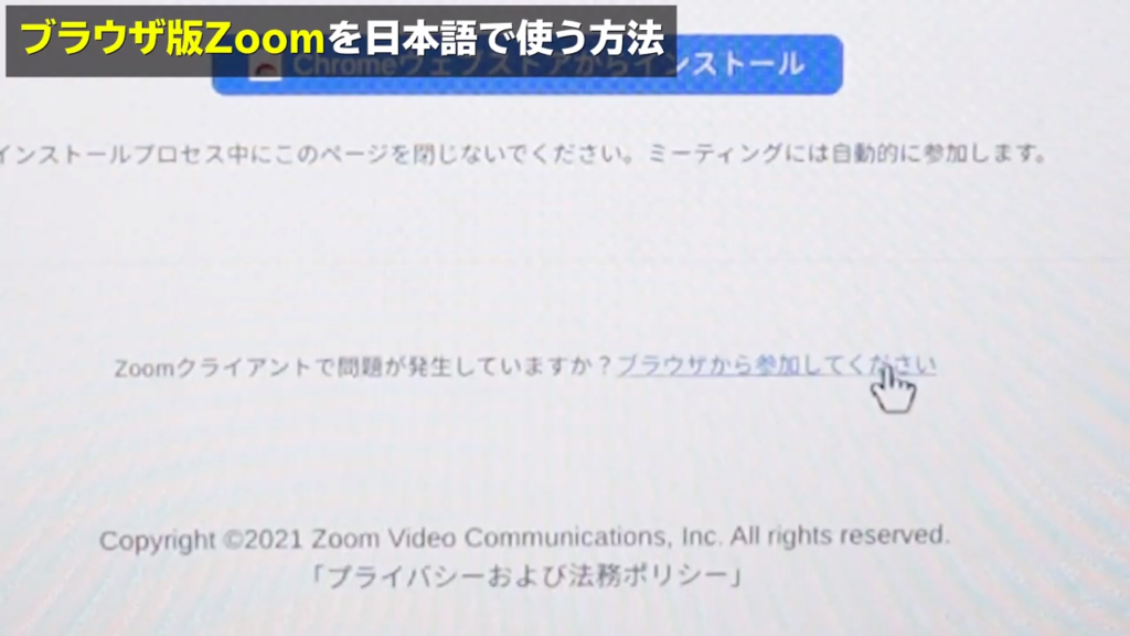 「ブラウザ版zoom」の場合、起動さえ出来れば日本語になっていますが、注意点があります。